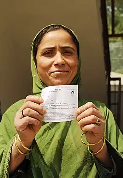 A woman voter displaying her voter slip at a polling booth during the 7th Phase of General Elections-2014 in Srinagar on April 30, 2014