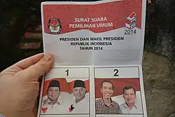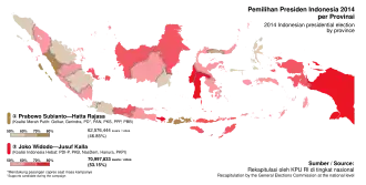 Presidential elections were held in Indonesia on 9 July 2014,[1] with former general Prabowo Subianto contesting the elections against the governor of Jakarta, Joko Widodo; incumbent president Susilo Bambang Yudhoyono was constitutionally barred from seeking a third term in office.[2][3] On 22 July the General Elections Commission (KPU) announced Joko Widodo's victory. He and his vice president, Jusuf Kalla, were sworn-in on 20 October 2014, for a five-year term.[4]