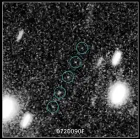 2014 MT69 was discovered by the New Horizons KBO Search with the help of the Hubble Space Telescope (HST)[8] because the object has a magnitude of 27.3, which is too faint to be observed by ground-based telescopes. Preliminary observations by the HST searching for KBO flyby targets for the New Horizons probe started in June 2014, and more intensive observations continued in July and August.[9][10] 2014 MT69 was first discovered in observations on June 24, 2014, during the preliminary observations, but it was designated 0720090F at the time,[2] nicknamed "7" for short.[3][4] Its existence as a potential target of the New Horizons probe was revealed by NASA in October 2014,[4] but the official name 2014 MT69 was not assigned by the Minor Planet Center (MPC) until March 2015 after better orbit information was available.[3] The parameters of the orbit have the extremely large uncertainty of 9 because follow-up observations after discovery eliminated 2014 MT69 as a potential target of the New Horizons probe, and no further follow-up observations were made.[4]