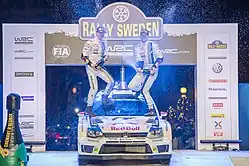 The event was won by Finland's Jari-Matti Latvala of the Volkswagen Motorsport team,[1] taking his third victory in Sweden,[2] and the ninth victory of his WRC career. He finished 53.6 seconds clear of his teammate Andreas Mikkelsen – taking his best WRC finish – while the podium was completed by Mads Østberg, a further 5.9 seconds in arrears.[3] Latvala's victory allowed him to take the championship lead from another teammate, Sébastien Ogier, who could only finish sixth in Sweden. In the supporting WRC-2 category, Karl Kruuda edged out Jari Ketomaa by 2.3 seconds for the victory.[4]