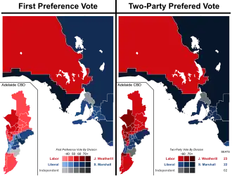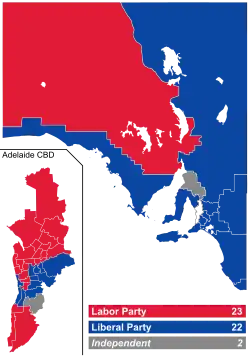 Although the state-wide two-party vote (2PP) was 47.0% Labor v 53.0% Liberal, the Adelaide metropolitan area containing over 75% of South Australia's population and 72% of seats (34 of 47) recorded a 2PP of 51.5% Labor v 48.5% Liberal.[9]