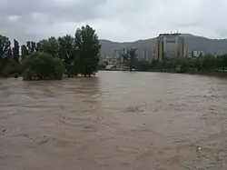 The city of Obrenovac was hit hardest by the floods, with an estimated 90% of the town flooded.[26] During the night between 15 and 16 May, nearby Kolubara river, collecting waters from southerly mountains, suddenly rose several meters above its banks and flooded the city, catching the residents by surprise. The entire city was evacuated.[27][28] During 18 May, the water level dropped, which enabled the evacuation of the citizens of Obrenovac to be carried out by trucks instead of boats.[29] As of 20 May the total number of evacuated persons exceeded 30,000.[30]