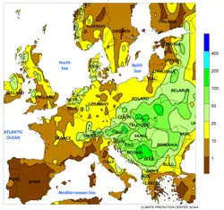 On 13 May, a low-pressure area formed over the Adriatic Sea, as polar air from Central Europe penetrated into the Mediterranean basin. The cold polar air mass met with humid subtropical air, leading to very low pressure. On 14 May, the low moved over Southeast Europe, becoming stationary. As a result, extremely heavy rain fell within the region; Serbia (in the area around Belgrade) and Bosnia were most affected.[18] Serbian and Bosnian meteorologists named the formed cyclone "Tamara".[19][20] On 15 May, the daily amounts of rainfall broke historical records in Belgrade (107.9 mm), Valjevo (108.2 mm) and Loznica (110 mm).[21] By 15 May, the monthly rainfall in Belgrade had broken the historical record (175 L from 1897), reaching 205 L.[22] By Saturday, May 17, the rain had subsided, and the weather gradually became warmer and sunnier, somewhat easing relief and rescue efforts. On 18 May, the cyclone moved further northwest.[20]
