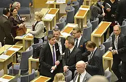 The agreement was so controversial, as 34% of respondents believed the deal to be "undemocratic" according to a survey.[26] The deal was also met with strong criticism from senior politicians of both blocks, including former Moderate Party leader Ulf Adelsohn denouncing it as "an unconditional capitulation", former Culture Ministers Lena Adelsohn Liljeroth and Cecilia Stegö Chilò, and former Defence Ministers Anders Björck and Mikael Odenberg, the latter describing the deal as "a defeat for democracy and parliamentarism".[27][28][26][29] Green Party MEP and former spokesperson Peter Eriksson stated the deal to be "a huge democratic problem" that "in its very function bypasses the usual rules of democracy". Eriksson also remarked that in most democratic countries making such a deal would not be possible.[26] The agreement was dissolved in 2015, however the centre-right parties Moderate, Liberals and Centre allow the centre-left social democrat minority government continue to govern.