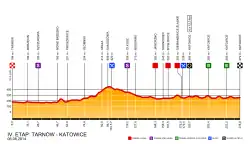 This stage was the longest stage of the 71st Tour de Pologne, and was almost identical to stage 4 the previous year. On the parcours of 236 kilometres (147 miles), there were three intermediate sprints in the towns of Jaworzno, Mysłowice and Siemanowice Śląskie, two special sprints in Szczurowa and Olkusz and two third-category climbs, both on the streets of Katowice, where the riders had to complete 4 laps of a 12.3-kilometre (7.6-mile) loop. There was some rolling terrain in the middle of the stage, yet none of the ascents were categorised. With the finish being on a downhill section of road by the Spodek arena, a sprint finish was expected to take place, with speeds reaching 70 kilometres per hour (43 mph).