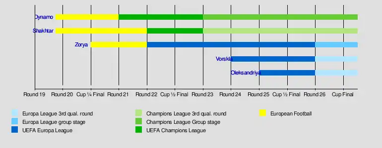 - After the 19th round and announcement made by the Adjudicatory Chamber of the UEFA Club Financial Control Body (CFCB) in regards to Dnipro Dnipropetrovsk (see the standings table), both Dynamo Kyiv and Shakhtar Donetsk qualified for European football for the 2016–17 season.[40]
