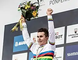 Alaphilippe said after the race that he had not been intending to go for the sprint at the end of the race; the team's plan was to set up Kwiatkowski. He started sprinting only after his directeur sportif shouted "go, go" at him over the radio. Alaphilippe said that he had briefly thought that he was going to win the sprint; his second-place finish was, however, the most important result of his career so far. He said, "For my first time performance here, I can't help but be pleased."[27] Albasini's third place was better than his team had expected: before the race, Orica–GreenEDGE's directeur sportif Matt White had not expected him to be as strong because of the addition of the extra climb. Albasini himself also described the race as "a lot tenser"; he also said that Valverde was "one of the strongest guys in those kinds of finishes".[28]