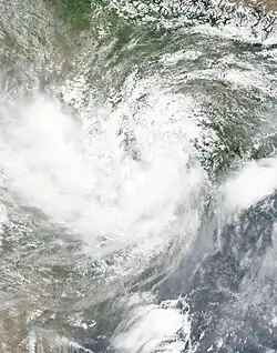An area of low pressure developed off the east coast of India on June 17, about 135 nmi (250 km; 155 mi) east-southeast of Visakhapatnam.[8] Over the next two days, deep convection developed along the southern and western periphery of the centre of the system, predominantly under the influence of the advancing southwest monsoon.[9] Due to the moderate-to-strong wind shear caused by the monsoon, the disturbance failed to develop any further, and the JTWC had reported that it dissipated on June 20.[10] At the same time, however, the IMD started tracking this system as a depression, reporting gusts of up to 35 kn (65 km/h; 40 mph).[11][12] The depression made landfall over Odisha coast early on June 21, between Gopalpur and Puri.[13] Without any further information, the IMD stopped tracking BOB 01 on June 22.[14]