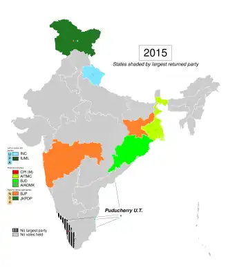Rajya Sabha elections were held in India in 2015 to elect eight members of the Rajya Sabha, the upper house of the Indian Parliament. Five by-elections were also held. The regular elections were held to fill seats in the States of Jammu and Kashmir,[1] Kerala,[2] and the Union Territory of Pondicherry.[3]