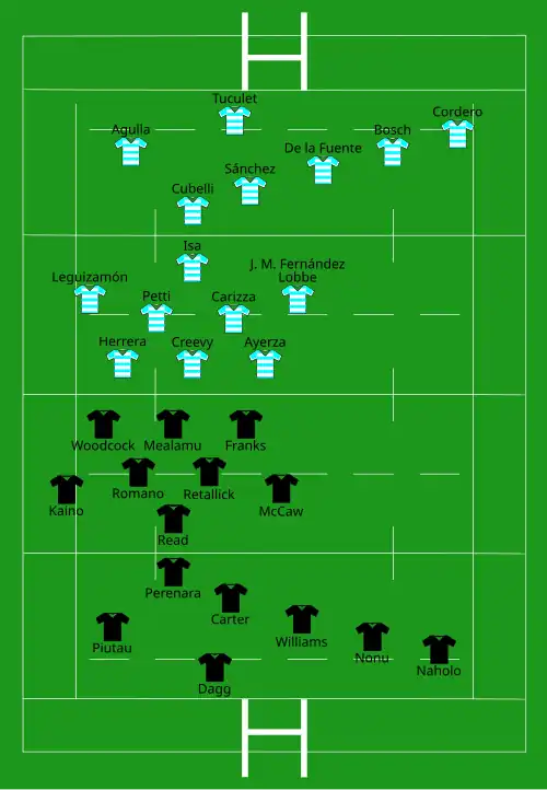 | Try: McCaw 20' m Nonu 40' c Piutau 42' c Read 48' c Taylor 71 c Con: Carter (4/5) 40', 44', 49', 73' Pen: Carter (2/4) 5', 16' | Report[6] | Try: Creevy (2) 55' m, 61' c Con: Sánchez (1/2) 61' Pen: Sánchez (2/3) 12', 33' |