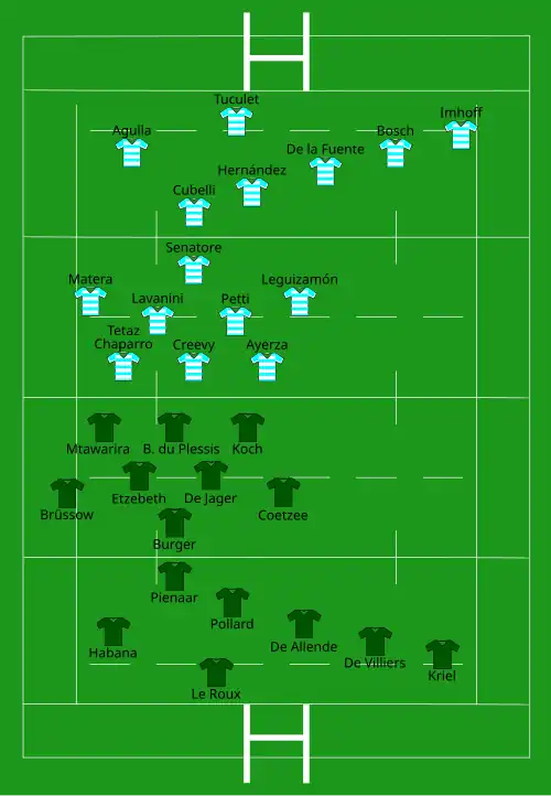 | Try: De Jager 35' c Le Roux 48' c Habana 78' m Con: Pollard (2/2) 36', 49' Pen: Pollard (2/2) 9', 28' | Report[11] | Try: Bosch 1' c Imhoff (3) 22' c, 30' c, 41' c Con: Hernández (4/4) 2', 23', 32', 42' Pen: Hernández (1/3) 37' Bosch (1/1) 39' Drop: Bosch (1/1) 62' |