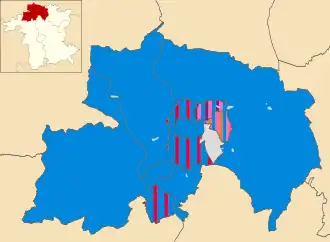 The whole of Wyre Forest District Council was elected in 2015 after boundary changes reduced the number of wards from 17 to 12 and the number of councillors from 42 to 33.[2] These changes meant ten wards elected three councillors each, while one ward elected two councillors and one ward elected a single councillor.[8] However the election in the Areley Kings and Riverside ward was delayed until June 2015 after the death of one of the candidates.[9]