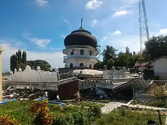 In the initial hours after the earthquake, structures across Aceh were reported to have been severely damaged. The dome of the Samalanga Mosque, Pidie's central mosque, had collapsed. Massive power outages occurred throughout Pidie and Pidie Jaya as telephone poles and electrical poles tumbled. Several houses collapsed during the quake. Roads were also damaged. Preliminary data suggest that 14 structures had collapsed during the quake, including a minimarket in Pidie. Photos of destroyed houses and buildings were circulated on social media.[16][17] Indonesian National Board for Disaster Management later [stated that] "many structures" were damaged, of which 25 suffered heavy damage.[18][19] Detailed information revealed that 72 stores had collapsed, 15 houses had been destroyed, 1 mall had collapsed, 5 mosques appeared destroyed and an Islamic school also had collapsed.[20] It was reported that dozens of Islamic students were trapped under an Islamic School in Bireun Regency.[21] Later reports revealed that 249 structures had been damaged in the quake, including 14 mosques and a hospital.[22] The Indonesian National Disaster Management Board later confirmed that 686 structures were either destroyed or damaged.[5]