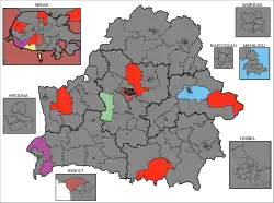 In contrast to the previous elections in 2012, the opposition did not boycott the elections, instead forming an alliance under the name Prava Vybaru (Belarusian: Права Выбару, Russian: Право выбора, 'The Right to Choose') consisting of the BPF Party, the Belarusian Christian Democracy, the Belarusian Social Democratic Party (Assembly), the Za svabodu movement, the United Civic Party of Belarus, the Belarusian Party "The Greens", the Belarusian Liberal Party of Freedom and Progress and the Trade Union of Electric Industry.[4] The Belarusian Left Party "A Just World" also contested the elections.[5]