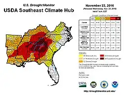 United States Drought Monitor image from November 22, 2016, showing exceptional drought across the Smoky Mountains of east Tennessee and southwest North Carolina.