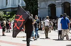 A crowd outside the California State Capitol after the riot. An anarchist flag is carried in the foreground. Debris lies on the plaza.