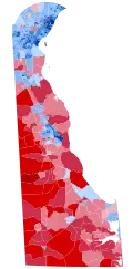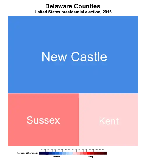 Clinton carried the state with 53.1% of the vote to Trump's 41.7%, a victory margin of 11.38%[2] Although Democrats continued their streak of winning Delaware, a state that has not gone to the Republicans in a presidential election since 1988, it swung 7.19% to the right relative to 2012, and Trump managed to flip Kent County. This was the first time since 1968 that Delaware did not vote for the same candidate as neighboring Pennsylvania. As of 2024, this is the last time the Republican nominee won Kent county with Trump failing to win the county again in both of his next presidential runs in 2020 and 2024.