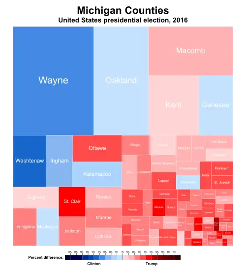 Michigan's largest county, Wayne County, home to Detroit, voted for Clinton by 37 points. She also managed to hold on to suburban Oakland County, the state's second-largest county, where residents tend to be more diverse and more white-collar, where instead third-party candidates gained votes, whilst Trump flipped the state's third largest county, Macomb County, which is home to more socially conservative but economically populist white blue-collar workers. As of the 2024 U.S. presidential election, this is the last time in which Kent County and Leelanau County voted for the Republican candidate, and the only time since 1976 that the Democratic presidential nominee won the nationwide popular vote without winning Michigan.
