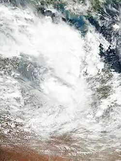 On the afternoon of 19 March, the Bureau of Meteorology reported on the development of a weak tropical low in the Torres Strait, north of Thursday Island.[43][44] Two days later, on the afternoon of 21 March, tropical cyclone advice bulletins were initiated as the tropical low began to develop, and a cyclone watch was issued for the far northeastern coastal region of the Top End.[45] At this stage, the system was forecast to coalesce into a tropical cyclone by 4:00 a.m. on 23 March (ACST), and then reach severe tropical cyclone strength by 4:00 p.m. the next day.[46] On the afternoon of 22 March, the Joint Typhoon Warning Center upgraded the strengthening system to a tropical storm.[47] Later on the same day, the Bureau of Meteorology identified that sustained gale-force winds had developed on the northern semicircle of the system;[48] however, the system was still classified as a tropical low as these winds did not extend more than halfway around the circulation centre. On 23 March, the system organized sufficiently into a tropical cyclone, and was named Nora by the BoM. Within the next couple of days, Nora intensified into a Category 3 Severe Tropical Cyclone, before making landfall on the Top End at that intensity. Afterward, Nora gradually began to weaken, degenerating into a tropical low soon afterward. On 26 March, Nora's remnant low stalled, and began to slowly meander counterclockwise over the Top End. On 27 March, Nora's remnant moved westward across the Gulf of Carpentaria. On the next day, Nora's remnant made landfall on the Australian coast once again and dissipated.