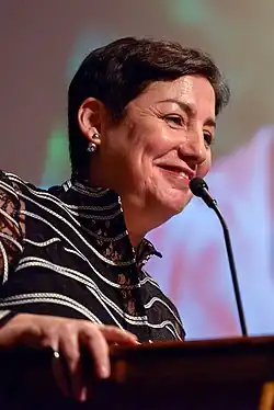 The journalist announced on 21 March 2017 during her own radio show that she was quitting her job to think about the possibility of running for president.[42] On 31 March 2017 she gained the official support from both Democratic Revolution and Autonomist Movement.[43] She launched her candidacy on 3 April 2017 at a rally near Plaza Baquedano in Santiago.[44] On 16 April 2017 she was proclaimed as candidate by the Humanist Party,[45] and on 23 April 2017 the Libertarian Left gave her its support.[46] On 9 May 2017 she was proclaimed as candidate by the Poder party,[47] and four days later by the Progressive Democratic Movement.[48] On 14 May 2017 the Autonomous Left proclaimed her as their candidate.[49] On 29 May 2017 the Liberal Party proclaimed her as their candidate,[50] while on 6 June 2017, the Green Ecologist Party did the same.[51] On 2 July 2017 she won the Broad Front primary with nearly 68% of the vote. Her primary win was officially sanctioned by the Election Court (Tricel) on 24 July 2017 during a ceremony in Santiago.[41] On 31 July 2017, Sánchez presented her campaign team, which included members of the Equality Party, which had supported her primary opponent, Alberto Mayol.[52]