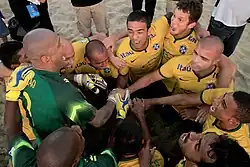 Despite Tahiti's Heimanu hitting the post and Labaste striking the crossbar in the opening moments of the final 12 minutes,[11] and surviving some defensive mistakes, Les Tiki Toa finally found themselves exposed and tiring at the back in the third period as Catarino scored a left-footed drive off the post on the counter attack once more to make the score 4–0. As Daniel scored a brace minutes later, first a header from a corner and the second finishing in the top corner from a loose ball at the edge of the Tahitian penalty area, Brazil's lead amassed in 29 minutes at 3–0 was doubled to 6–0 in just 4 minutes as the flood gates opened.[3] The Brazilians went on to see out the final minutes to ease to another world title, the 100th international beach soccer trophy in their history.[13]