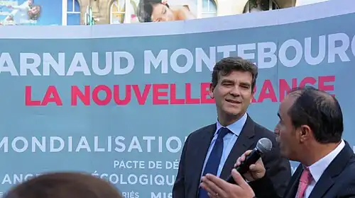 Valls' most prominent opponent was initially considered to be former economy minister Arnaud Montebourg,[35] who formally unveiled his platform in Paris on 3 January. The left-wing firebrand proclaimed that French employees should receive wage rises equivalent to executives' in order to constrain corporate pay and called for a "supertax" on banks to raise €5 billion a year. Challenged by former education minister Benoît Hamon, who argued that the focus on economic growth and employment is misplaced, Montebourg argued that the prior was a "necessity" and claimed that he "challenged the theory of the end of work." He also criticized a perceived European obsession with austerity, condemning it as the cause of the country's persistently high rates of unemployment and dismal economic growth, promising to "liberate the French from European-imposed austerity."[41] He also pledged during the campaign that he would not comply with EU deficit rules, in contrast to Valls, embark upon an "economic patriotism" (described as protectionism by some observers), reserve 80 percent of government contracts for French small businesses, reinstate border controls, repeal the El Khomri jobs bill, defend small domestic businesses, warn that he might engage in a trade war against China, and support a €30 billion infrastructure plan.[42][43]