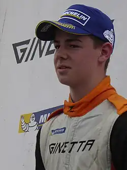 Tom Gamble, after finishing third in the second race at the Knockhill round. Gamble won the championship by 27 points ahead of his closest rival, Sebastian Priaulx.