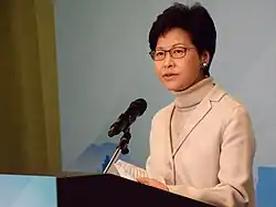 Professionals and activists formed a loose coalition called "Democrats 300+" hoping to snatch over 300 seats in the Election Committee Subsector elections based on the common platform of opposing Leung Chun-ying's second term, many of whom adopted the slogan "ABC" (Anyone but CY).[40] The camp decided not to field a candidate in the election, but rather boost the chances of an alternative establishment candidate.[41] On 9 December, two days before the election, Leung surprisingly announced he would not seek re-election, citing his daughter's ill health, which made him the first Chief Executive to serve only one term.[31] After Leung's announcement, Chief Secretary for Administration Carrie Lam, who previously said she would retire, expressed that she would have to reconsider running for Chief Executive in order to continue Leung's policies.[42]
