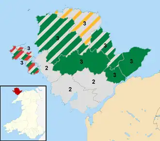 ![]() Map showing the results of the 2017 Isle of Anglesey Council elections. Striped wards have mixed representation. | |||||||||||||||||||||||||