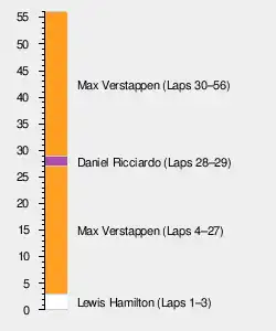 Kimi Räikkönen pulled off the grid due to a power unit issue. Hamilton got off well with Ricciardo, Bottas and Verstappen behind. Verstappen overtook Hamilton for the lead on lap 4, and led until lap 28 when he pitted, leaving Ricciardo in the lead. Ricciardo then also pitted and Verstappen retook the lead. Coming into the last laps, Hamilton tried fighting back but Verstappen won comfortably to take his second win in his career, a year after his previous at the 2016 Spanish Grand Prix.