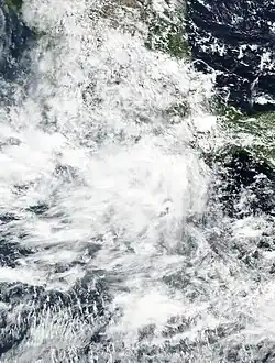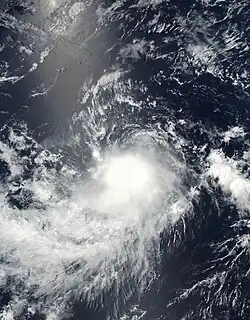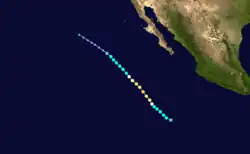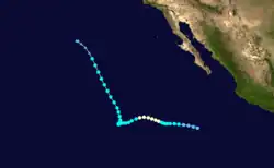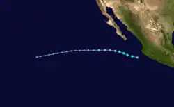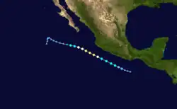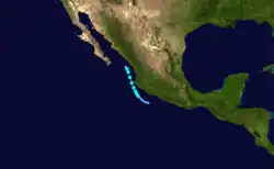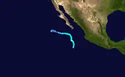 A low-pressure trough began producing disorganized convection over the waters of the Pacific Ocean, well to the south of Baja California Peninsula, on July 14.[54] Despite only marginally conducive environmental conditions, the disturbance began to show signs of organization two days later,[55] and it attained tropical depression status by 06:00 UTC on July 17.[56] Strong west-northwesterly wind shear confined the storm's intermittent bursts of convection well to the southwest of its low-level circulation, and the depression consequently failed to produce winds above 35 mph (55 km/h).[57] The system's center later degenerated into a low-pressure trough within the Intertropical Convergence Zone, prompting the NHC to discontinue advisories at 21:00 UTC on July 20.[58]
