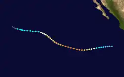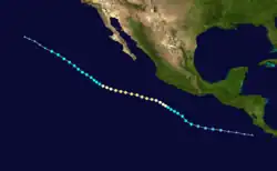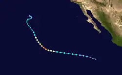 Although hurricane season in the eastern Pacific does not officially begin until May 15, and on June 1 in the central Pacific,[6] activity began several days prior with the formation of a tropical depression in the eastern region on May 9. This was the earliest formation of a tropical cyclone on record in the eastern Pacific basin proper,[7] until broken by Tropical Depression One-E in 2020. When it intensified into Tropical Storm Adrian a few hours later, the system became the earliest named storm on record in the region,[8] a record that stood until broken by Tropical Storm Andres in 2021.[9] Near normal activity occurred in June, with Tropical Storm Calvin formed on June 11, and Hurricane Dora on June 25.[10] For the third year in a row, July featured above average activity, with the fifth highest ACE value for that month on record.[11] This total was due to long-lived hurricanes Eugene, Fernanda, Hilary, and Irwin. August saw significantly less activity, with only three storms forming in the month; however it featured Hurricane Kenneth, the third major hurricane of the season. September featured four storms, including Hurricane Otis, which became the fourth major hurricane of the season. Only two storms formed after October 1, Ramon and Selma. Both did not attain hurricane status, though Selma became the first and last storm to make landfall in El Salvador. No systems were active in November for the first time since the 2010 season. The Accumulated Cyclone Energy index for the 2017 Pacific hurricane season as calculated by Colorado State University using data from the National Hurricane Center was approximately 100.7 units,[nb 5][12] about 20 percent near average.