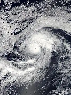 Hurricane Eugene developed from a disturbance located 765 mi (1,231 km) south of the southern tip of the Baja California Peninsula on July 7.[31] On the following day, Eugene underwent a period of rapid intensification; in an 18-hour period starting at 21:00 UTC on July 8, Eugene intensified from a tropical storm with 70 mph (115 km/h) winds to a Category 3 hurricane with 115 mph (185 km/h) winds, making it the first major hurricane of the season.[32][33] However, by 12 hours later, the entrainment of dry air caused Eugene to weaken to a Category 2 hurricane,[34] and due to traveling over cooler waters, Eugene weakened to a tropical storm on the following day.[35] As the coverage of deep convection steadily dwindled, Eugene fell to tropical depression intensity around 15:00 UTC on July 12, and degenerated to a remnant low six hours later.[36][37]