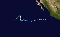 With impressive outflow and an eye apparent on satellite imagery,[29] the storm peaked with maximum sustained winds of 105 mph (170 km/h) and a minimum barometric pressure of 974 mbar (28.8 inHg) by 18:00 UTC June 26. Dora remained a Category 2 hurricane for about 12 more hours before beginning to rapidly weaken over cooler sea surface temperatures and in an environment of drier air, falling to Category 1 intensity at 06:00 UTC on June 27 and deteriorating to a tropical storm around 18:00 UTC. The storm later degenerated into a remnant low near Socorro Island early on June 28, after all of the storm's convection had been diminished. The remnant low moved slowly over the eastern Pacific before dissipating early on July 1.[28] The outer bands of Dora brought heavy rains to Guerrero, resulting in flash floods that inundated 20 homes. Overall damage was minor, however.[30]