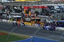 A lengthy green flag period followed the restart, with Power leading the way. Behind him, positions in the top five changed often, as Pagenaud, Dixon, Kanaan, Vautier, and Hildebrand battled for positions. On lap 139, caution flew again, this time for debris. The leaders once again took advantage of the caution to make pit stops, but Max Chilton elected to stay out, placing him in the lead of the race. On lap 149, racing resumed, with Chilton able to briefly hold his lead before Power once again moved past him to resume command of the race. On lap 152, Kanaan moved wide coming towards turn 3, making contact with Hinchcliffe, who had Aleshin outside of him.[13] Hinchcliffe then spun, causing a large crash that took out himself, Aleshin, Carpenter, Hildebrand, Vautier, Ed Jones, Ryan Hunter-Reay, and Muñoz in an incident compared to The Big One at similar pack-racing NASCAR races.[14] Carpenter and Hildebrand would eventually return to the race course, but several laps down. The incident forced the race to be red flagged to allow for clean-up. During the red flag, INDYCAR and Firestone officials, in response to continuing issues with blistering tires, elected to have competition caution periods and mandatory tire stops after 30 green flag laps for the remainder of the race. Also during the red flag period, officials assessed a stop and 20-second hold penalty to Kanaan for his role in the eight-car pileup, which, once the race restarted, put him two laps down.[15]