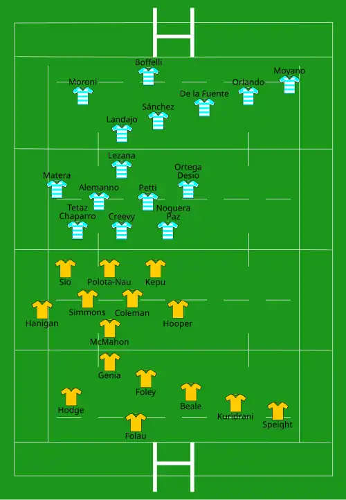 | Try: Folau (2) 28' c, 54' c Kepu 48' c Genia 71' c Phipps 73' c Uelese 80' c Con: Foley (6/6) 30', 49', 54', 73', 75', 80' Pen: Foley (1/1) 5' | Report[18] | Try: Landajo 22' c Moroni 77' c Con: Sánchez (2/2) 23', 78' Pen: Sánchez (2/3) 14', 35' |