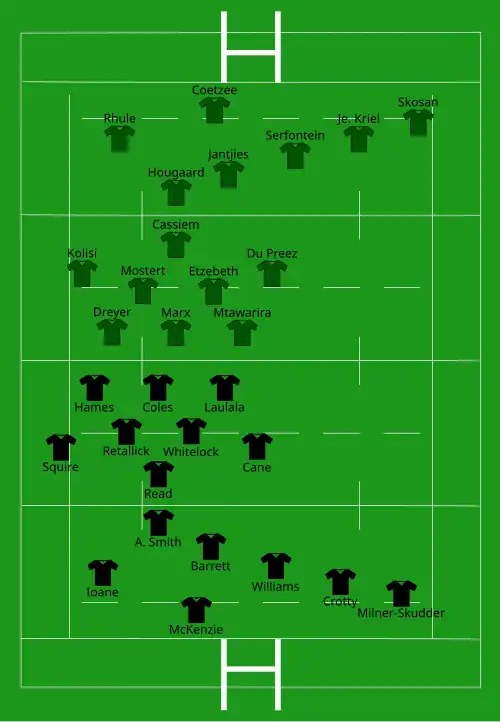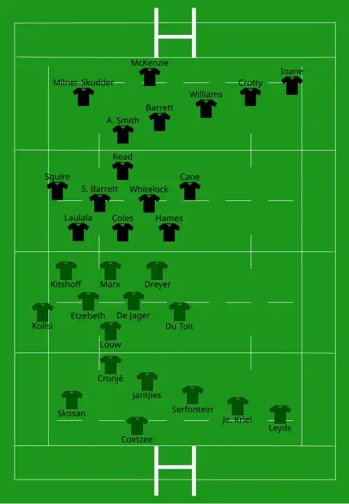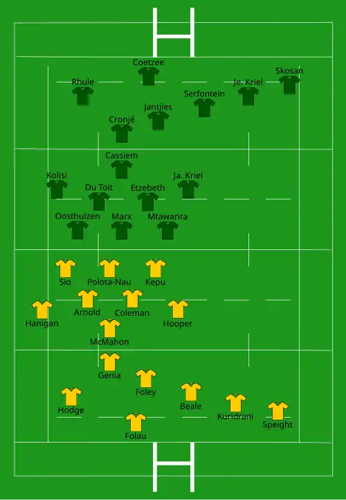 | Try: Beale 26' c Polota-Nau 46' c Con: Foley (2/2) 28', 47' Pen: Foley (3/3) 7', 40', 69' | Report[14] | Try: Je. Kriel 24' c Marx 58' c Con: Jantjies (2/2) 26', 59' Pen: Jantjies (3/3) 3', 53', 67' |