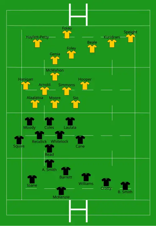 | Try: Ioane 21 c A. Smith 40' c B. Barrett (2) 60' c, 77' c B. Smith 70' c Con: B. Barrett (5/5) 22', 40', 62', 72', 78' | Report[7] | Try: Folau 1' m Hooper 10' c Foley 14' m Genia 66' m Beale 76' c Con: Foley (2/5) 11', 76' |
