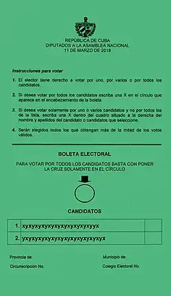 All Cuban citizens who are over the age of 18 years, and possess full political rights for at least five years prior to the election are eligible to partake within the election.[3] 50% of candidates must be nominated by people from the municipality and elected by direct vote in local assemblies, where people decide who they consider to have the qualities to best represent them.[4] The other 50% of candidates are proposed by candidacy commissions which comprise representatives of workers, youth, women, students, and farmers, as well as members of the Committees for the Defense of the Revolution.[3] The final list of candidates, which corresponds to the number of seats to be filled, is drawn up by the National Candidacy Commission taking into account criteria such as candidates' merit, patriotism, ethical values, and revolutionary history.[3]