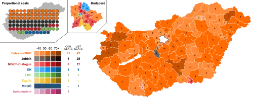 The result was a victory for the Fidesz–KDNP alliance, preserving its two-thirds majority, with Viktor Orbán remaining Prime Minister. Orbán and Fidesz campaigned primarily on the issues of immigration and foreign meddling, and the election was seen as a victory for right-wing populism in Europe.[1][2][3]