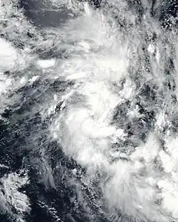At around 23:00 UTC on 22 February, the BOM reported that a tropical low had developed within a low-pressure trough over the far-eastern Indian Ocean.[75] Located approximately 285 km (177 mi) south-southwest of Indonesia's Sumba island, the system remained slow-moving initially, before adopting a track towards the southwest on 23 February.[76][77] The tropical low developed rapidly in a favourable environment for intensification characterised by abundant atmospheric moisture, sea surface temperatures in excess of 30 °C (86 °F), low vertical wind shear and strong outflow in the upper troposphere.[77][78] The tropical low's convective structure improved considerably during the night, and the JTWC upgraded the system to a tropical storm on the Saffir–Simpson hurricane wind scale (SSHWS) at 18:00 UTC.[78] The BOM followed suit at 00:00 UTC on 24 February, officially upgrading the system to a Category 1 tropical cyclone on the Australian scale and assigning the name Ferdinand.[79]