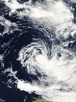 The storm continued intensifying, indicated by an improvement of the storm's structure over the proceeding hours. The storm eventually reached its peak intensity with 1-minute sustained winds of 90 mph (145 km/h) and 969 millibars with a small, ragged eye forming on microwave imagery on 13 January. Despite this, a decrease in sea surface temperatures as it quickly accelerated eastwards caused the storm to rapidly weaken throughout 14 January, indicated by a loss of deep convection near the storm's center. The next evening on 15 January, the BOM issued their last advisory on Claudia as it began to weaken.[28] Claudia dissipated as a tropical low on 17 January.[29]