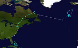 A large area of disturbed weather persisted over the central subtropical Atlantic in mid-November. On 19 November, this area of thunderstorm activity developed sufficiently to be designated Tropical Storm Sebastien by the National Hurricane Center in Miami, Florida.[79] After several days of slow movement, Sebastien accelerated towards the north-east and began slowly losing tropical characteristics. The system completed its extratropical transition late on 24 November,[79] becoming extratropical Storm Sebastien in the process.[80][81]