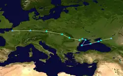Cecilia weakened as it crossed the Iberian Peninsula and emerged into the Mediterranean Sea, crossing Italy as a weak frontal system on 25 November.[76] Continuing slowly eastwards, Cecilia was last noted over the Black Sea on 28 November[77] before being absorbed by Storm Sebastien over southern Ukraine on 29 November.[78]