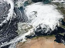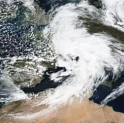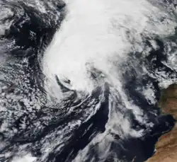 The precursor to Storm Bernardo was first noted as a deep low over north-eastern Canada on 7 November.[56] After considerably weakening and crossing the Atlantic without any notable impacts, the system was named Bernardo by the State Meteorological Agency of Spain (AEMET) on 9 November as it was approaching the Iberian Peninsula from the Bay of Biscay.[14] Bernardo crossed northern Spain and emerged into the Mediterranean Sea, affecting the Balearic Islands on 10 November with wind gusts of up to 111 km/h (69 mph; 60 kn) recorded in the Alfabia Mountains along the north-west coast of Mallorca.[57] On 11 November, Bernardo strengthened to its peak intensity of 996 mbar (29.4 inHg)[58] and formed an eye-like feature, leading several media outlets to report that the storm had medicane-like characteristics.[59] However, AEMET did not confirm that the storm had reached medicane status.[57]