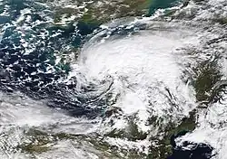 After losing its brief eye-like feature, Bernardo followed the coast of Algeria, remaining closely offshore as it moved eastwards across the Mediterranean before stalling over southern Italy for two days.[60][61][62] Bernardo then accelerated to the north-east as a weak frontal boundary, moving over the Baltic states on 14 November[63] and into northern Russia on 15 November.[64] After briefly reintensifying and then weakening once more, Bernardo was last noted as a weak low over Siberia on 18 November.[65]