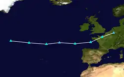 The precursor to Storm Cecila was first noted as a developing low between the Carolinas and Bermuda on 16 November.[69] It subsequently deepened and slowly moved north-eastwards parallel to the East Coast of the United States,[70] before crossing Newfoundland and emerging into the open Atlantic by 21 November.[71] At this point, the system was named Cecilia by the State Meteorological Agency of Spain (AEMET), who issued warnings for rain and wind impacts across the Iberian Peninsula and on the Balearic Islands.[15] Weather warnings were also issued in southern and coastal western France.[72]
