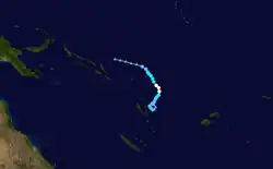 Due to an area of high pressure to its east, Sarai took a southerly course during its early stages as a named system.[43] The high pressure region would later shift its orientation, causing Sarai to gradually curve towards the east.[44] On December 27, the cyclone's winds increased further past Category 2 cyclone thresholds, with one-minute sustained winds to hurricane-force.[45] The following day, the FMS assessed a peak intensity with ten-minute sustained winds of 110 km/h (68 mph).[46] At the time, a large eye was evident on microwave satellite data while the storm tracked towards the southeast along the periphery of the jet stream, and remained present throughout the day.[47][48][49] Sarai reached its lowest barometric pressure on December 29 before weakening due to increasing wind shear of 55–65 km/h (34–40 mph), resulting in a loss of organisation.[50][51][52] Sarai's center of circulation became displaced from the storm's convection on December 30, and the storm weakened to Category 1 strength.[53] Its center tracked near Nukuʻalofa on December 31 while the storm's structure rapidly deteriorated, with the JTWC issuing their final advisory that day.[54] The FMS continued monitoring the system as an ex-cyclone as the storm accelerated eastward, highlighting a low possibility for regeneration;[55] the agency ultimately issued their final bulletin on the system on January 2.[56]