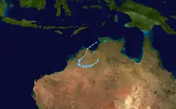The system continued towards the southwest over the ensuing hours, paralleling the coast of Western Australia. Despite tracking over land, the tropical low showed signs of organisation, with the generally favourable atmospheric conditions allowing the development of formative convective banding in the system's southern semicircle.[87] After reaching the Dampier Peninsula on 20 December, the system turned sharply to the east and began tracking further inland.[88][89] By the following day, the tropical low became slow-moving over the southeastern Kimberley region, during which time a minimum atmospheric pressure of 992.5 hPa (29.31 inHg) was recorded at Halls Creek.[90][91] During the next couple of days, the system continued moving eastward, before dissipating on 23 December.