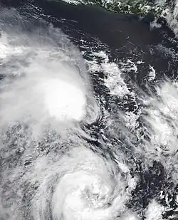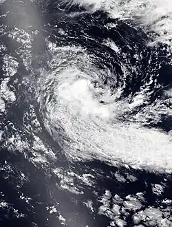 On 6 December, the Bureau of Meteorology (BOM) reported that a tropical low had developed within a monsoon trough near the western end of Java, approximately 200 km (120 mi) north-northeast of Christmas Island.[26][27] The system was assigned the official identifier code 02U upon formation.[26] Initially located in an unfavourable environment for intensification, the tropical low began to encounter somewhat improved conditions as it tracked towards the southeast.[28][29] On 7 December, warm sea surface temperatures and strong diffluence in the upper troposphere fuelled the development of deep convection around the system's low-level circulation centre. Referencing the tropical low's quickly improving structure and the presence of a weak eye feature in microwave satellite imagery, the Joint Typhoon Warning Center (JTWC) issued a Tropical Cyclone Formation Alert for the system at 05:30 UTC.[28] After tracking in a clockwise path around the northeastern side of Christmas Island, Tropical Low 02U became quasi-stationary on 8 December.[30][31] Deep convection continued to develop near the centre during the overnight period, and as the low began to track eastwards, the JTWC upgraded the system to a tropical storm on the Saffir–Simpson hurricane wind scale at 18:00 UTC on 8 December.[32]
